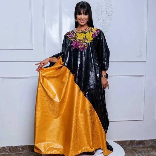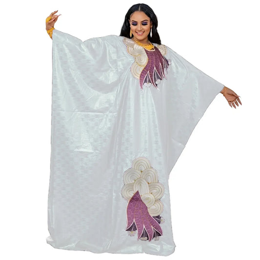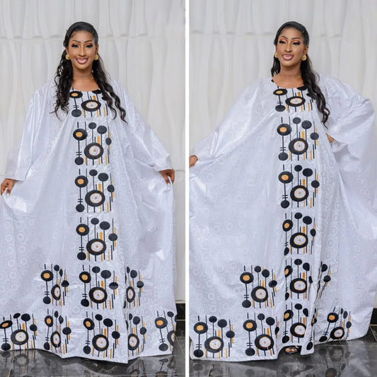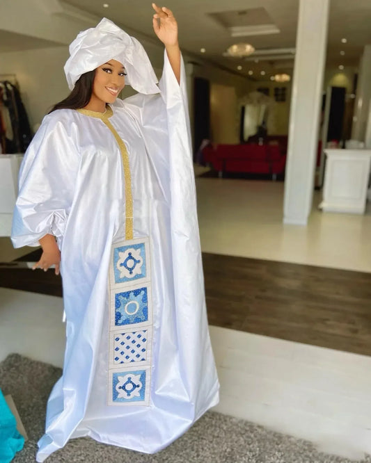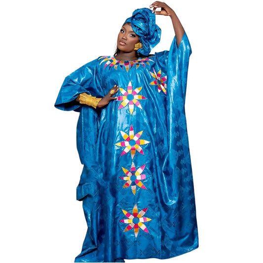 African Bazin Embroidery Long Maxi Dress with Scarf