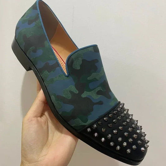 Handcrafted Men's Luxury Rivet Loafers: New Camouflage Spiked Slip-Ons in Leather, Perfect for Casual and Dressy Occasions