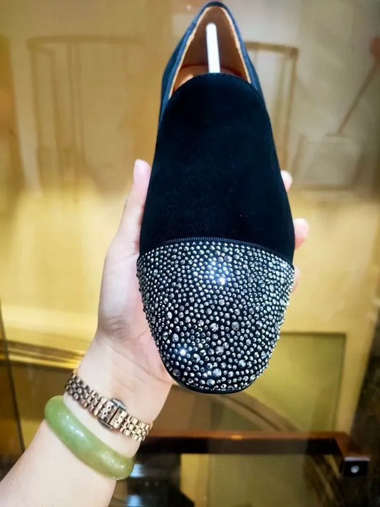 Experience Luxe Comfort: Black Suede Men's Loafers Adorned with Grey Rhinestones - Premium Slip-On Smoking Slippers for Men
